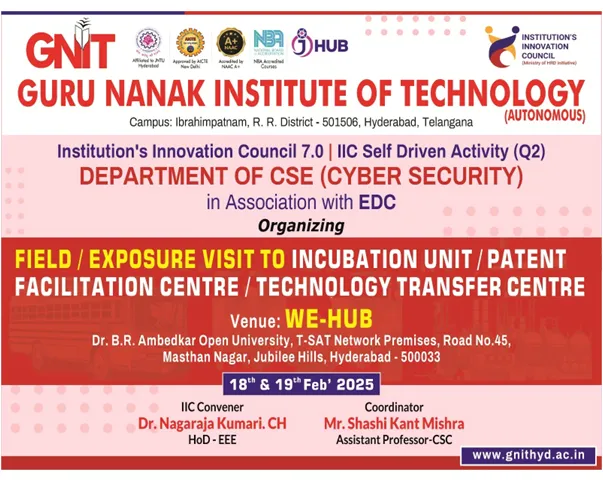 The Department of CSE (Cyber Security) of Guru Nanak Institute of Technology (Autonomous), under the banner of Institution’s Innovation Council (IIC) 7.0 and in association with EDC, organized a Field/Exposure Visit to Incubation Unit/Patent Facilitation Centre/Technology Transfer Centre as part of the IIC Self-Driven Activity (Q2). The visit was held on 18th and 19th February 2025 at WE-HUB, Dr. B.R. Ambedkar Open University, T-SAT Network Premises, Jubilee Hills, Hyderabad. The objective of this visit was to provide students with hands-on exposure to innovation ecosystems, start-up incubation, patent processes, and technology transfer mechanisms. Students interacted with professionals and gained valuable insights into entrepreneurship, innovation support systems, and the functioning of technology incubation units. The visit enhanced their understanding of real-world applications of technology and motivated them to explore innovative ideas and entrepreneurial ventures. The event was successfully coordinated by Mr. Shashi Kant Mishra, Assistant Professor (CSE), under the guidance of Dr. Nagaraja Kumari. CH, HoD–EEE & IIC Convener.