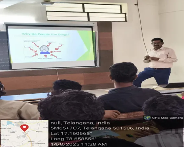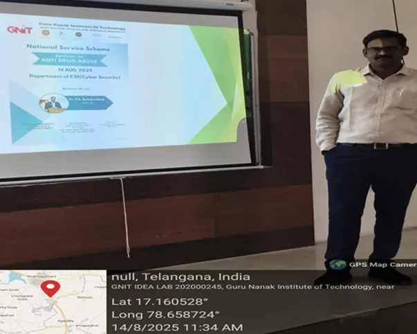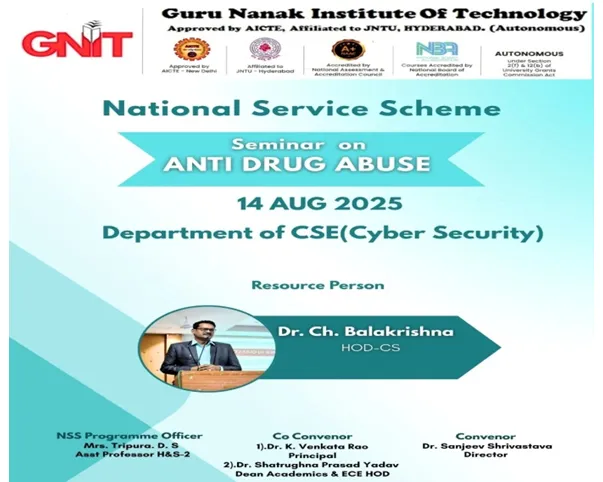 The National Service Scheme (NSS) unit of Guru Nanak Institute of Technology (Autonomous) organized a Seminar on Anti-Drug Abuse on 14th August 2025. The event was conducted by the Department of Computer Science and Engineering (Cyber Security) to spread awareness among students about the harmful effects of drug abuse and the importance of leading a healthy, disciplined life. The seminar featured Dr. Ch. Balakrishna, Head of the Department of Computer Science, as the resource person, who delivered an insightful talk emphasizing the social and psychological consequences of drug addiction. The event was convened by Dr. Sanjeev Shrivastava (Director) and co-convened by Dr. K. Venkata Rao (Principal) and Dr. Shatrughna Prasad Yadav (Dean Academics & ECE HOD). The program was coordinated by Mrs. Tripura D. S, NSS Programme Officer and Assistant Professor in H&S. The seminar successfully motivated students to adopt a drug-free lifestyle and contribute positively to society.
