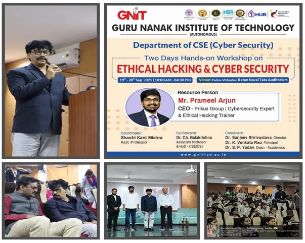 The Department of Computer Science and Engineering (Cyber Security) at Guru Nanak Institute of Technology (Autonomous) organized a Two-Day Hands-on Workshop on Ethical Hacking and Cyber Security from 19th to 20th September 2025 at the Padma Vibhushan Ratan Naval Tata Auditorium. The workshop aimed to provide students with practical exposure to the latest tools, techniques, and methodologies used in ethical hacking and cybersecurity defense. The resource person, Mr. Prameel Arjun, CEO of Prikus Group, a renowned cybersecurity expert and ethical hacking trainer, conducted engaging sessions that combined theory with real-world demonstrations. The event was coordinated by Mr. Shashi Kant Mishra (Assistant Professor) and co-convened by Dr. Ch. Balakrishna (Associate Professor & HOD–CSE(Cyber Security)). It was held under the guidance of Dr. Sanjeev Shrivastava (Director), Dr. K. Venkata Rao (Principal), and Dr. S. P. Yadav (Dean–Academics). The workshop significantly enhanced students’ understanding of cybersecurity practices and prepared them to address modern digital threats effectively.