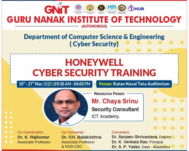 The Department of Computer Science and Engineering (Cyber Security) at Guru Nanak Institute of Technology (Autonomous) organized a Honeywell Cyber Security Training program from 10th to 27th March 2025, held at the Ratan Naval Tata Auditorium. The training sessions were conducted from 9:30 AM to 4:00 PM and featured Mr. Chaya Srinu, Security Consultant at ICT Academy, as the resource person. The event aimed to provide students with in-depth knowledge and hands-on experience in the field of cyber security, aligning academic learning with current industry practices. The program was coordinated by Dr. K. Rajkumar (Associate Professor) and co-convened by Dr. Ch. Balakrishna (Associate Professor & HOD-CSE(Cyber Security)), under the guidance of conveners Dr. Sanjeev Shrivastava (Director), Dr. K. Venkata Rao (Principal), and Dr. S. P. Yadav (Dean – Academics). This initiative reflected GNIT’s commitment to fostering technical excellence and preparing students for emerging challenges in cyber security.