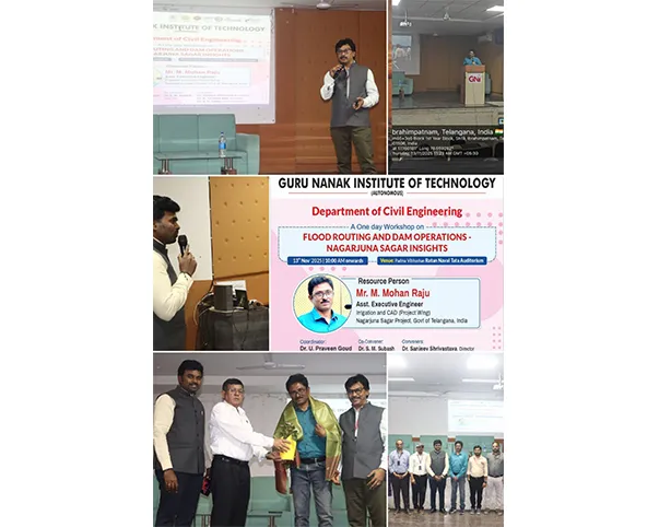 The Department of Civil Engineering, Guru Nanak Institute of Technology (GNIT), organized an impactful one-day workshop on 13-11-2025 at the Padma Vibhushan Ratna Naval Tata Auditorium, GNIT. The workshop focused on the topic “Flood Routing and Dam Operations – Nagarjuna Sagar Insights.” Mr. M. Mohan Raju, Assistant Executive Engineer, Irrigation & CAD (Project Wing), Nagarjuna Sagar Project, Government of Telangana, served as the resource person. The session provided students with valuable technical knowledge on flood management, dam operational procedures, and practical insights from one of India's major irrigation projects. This workshop greatly enhanced students' understanding of real-world hydrological and irrigation engineering practices.